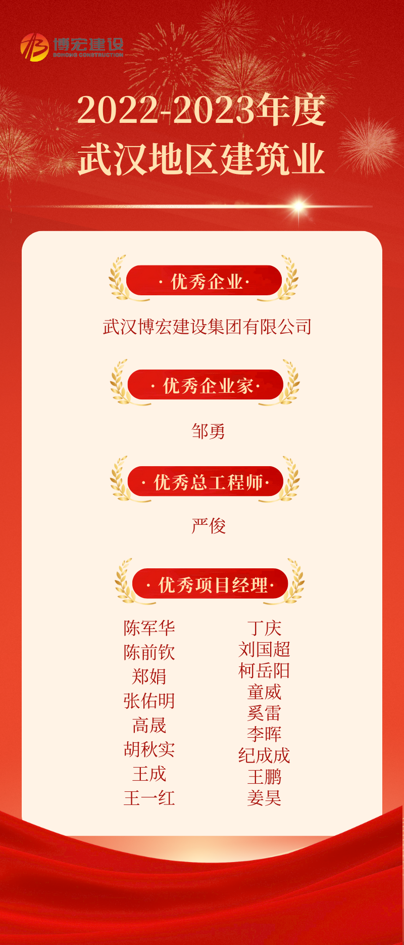 近日,2022-2023年度武漢地區建筑業優秀企業、優秀企業家、優秀總工程師、優秀項目經理選樹結果正式發布,博宏建設集團喜獲“大豐收”,獲評1項優秀企業、1人獲評優秀企業家、1人獲評優秀總工程師、17人獲評優秀項目經理!