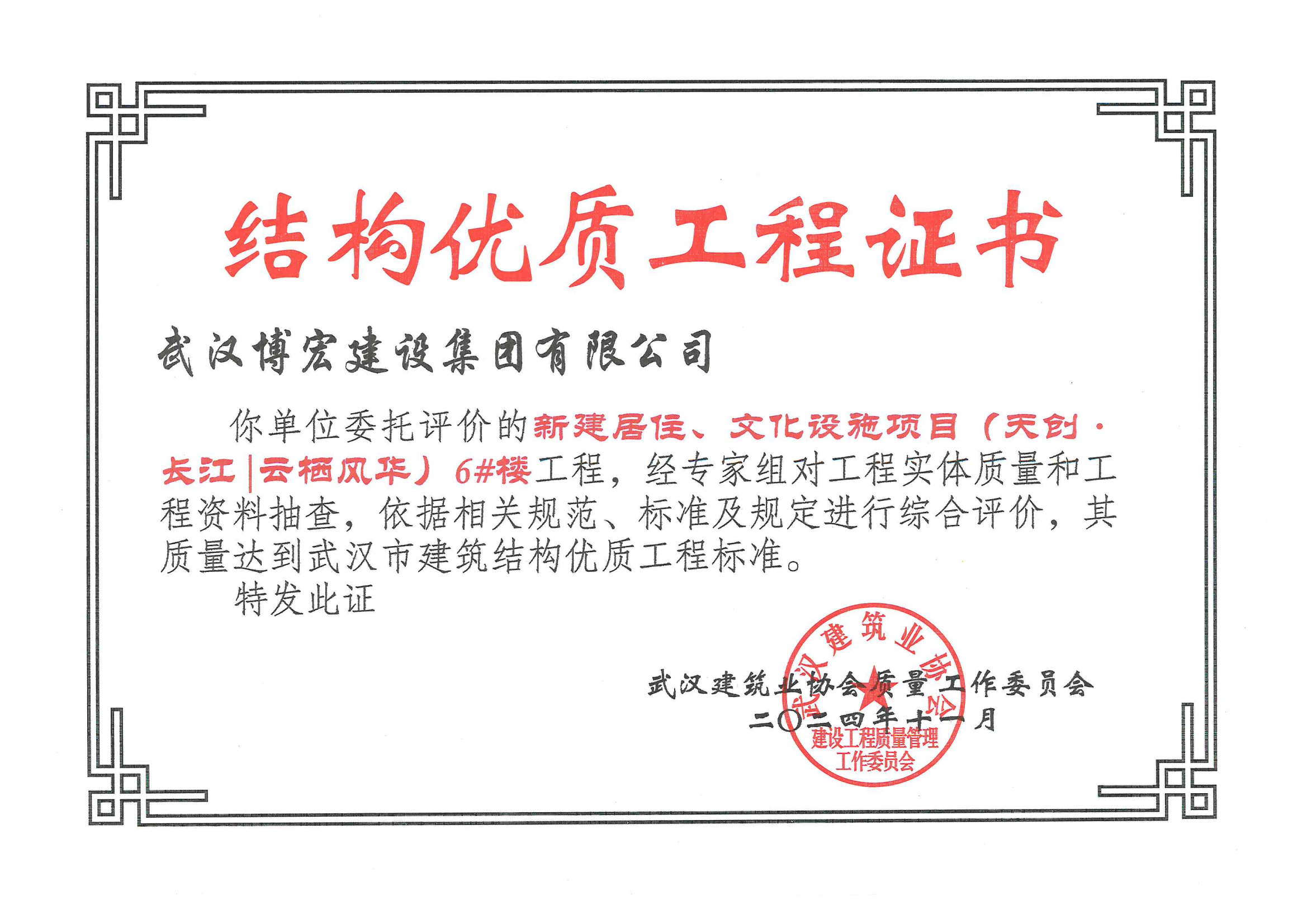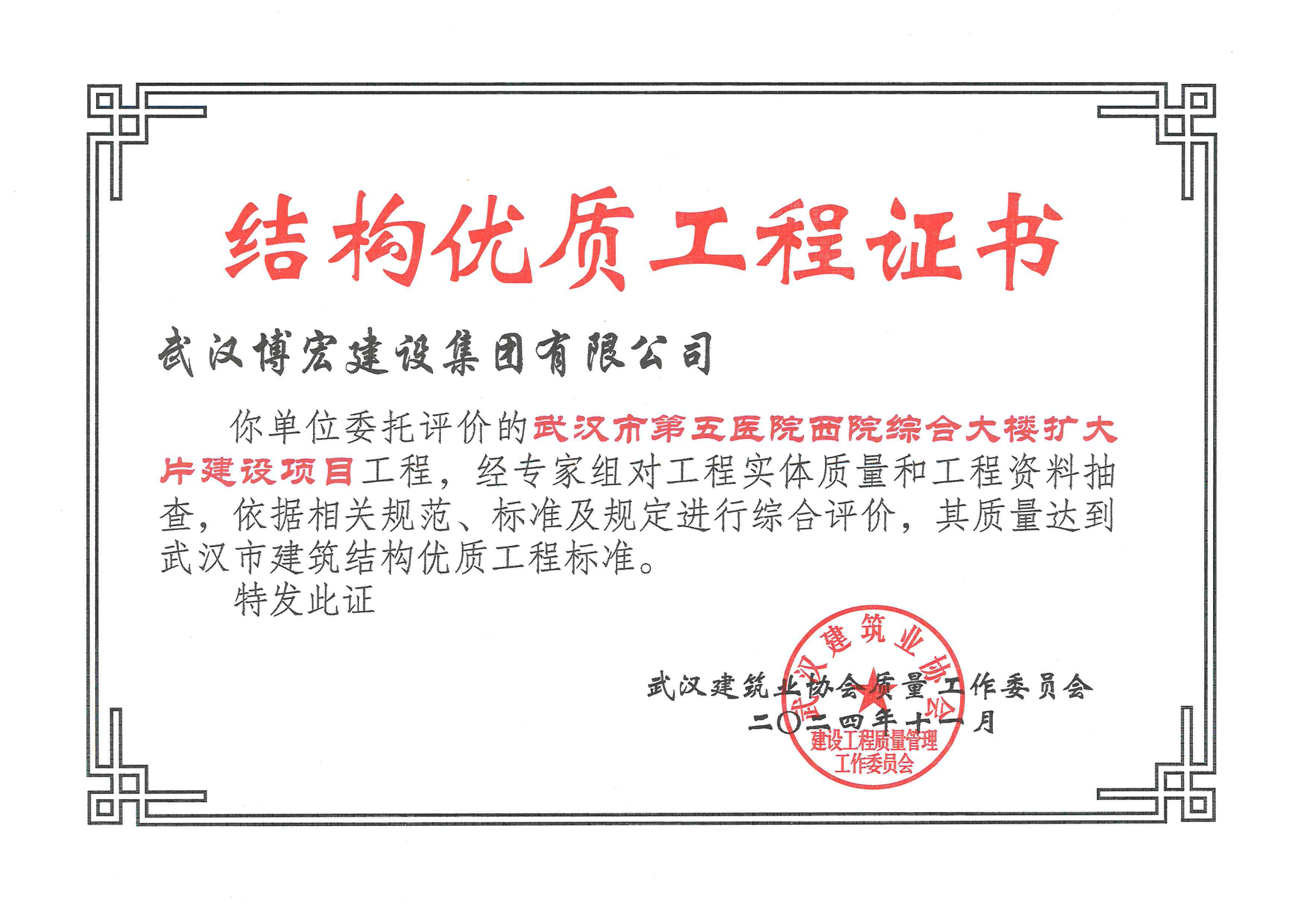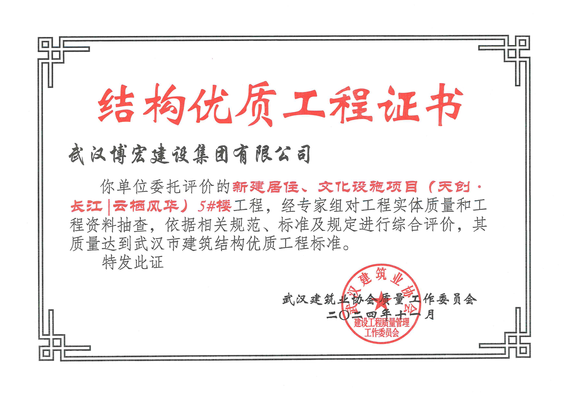 近日,公司承建的武漢市第五醫院西院綜合大樓擴大片建設項目,新建居住、文化設施項目(天創·長江丨云棲風華)4#、5#、6#樓獲評武漢市建筑結構優質工程,標志著項目在工程結構設計、工程施工管理、過程質量控制等方面均達到市級優質認證,在安全、耐久、美觀等方面都具有較高的水平。